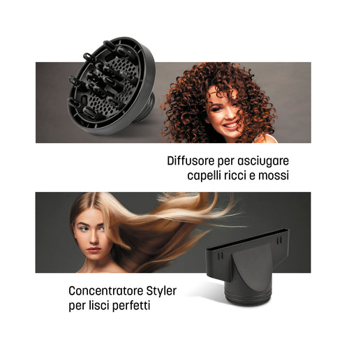 Texta Gold è un asciugacapelli professionale di alta qualità, in grado di generare un flusso d’aria ad alta potenza e velocità, per un’asciugatura più veloce e uno styling più duraturo. Il motore AC e l’alta potenza (2200W) garantiscono affidabilità e prestazioni a livello professionale. La funzione di rilascio ioni negativi migliora la morbidezza e la brillantezza dei capelli, mentre riduce la secchezza e l’effetto crespo. Le 6 possibili combinazioni d’uso calore/velocità permettono di scegliere il tipo di asciugatura: delicata per diffusione su capelli ricci, regolare per non danneggiare il capello, rapida per uno styling perfetto.Texta Gold include il diffusore per capelli ricci e mossi ed il concentratore Styler per lisci perfetti. Dotato di ampio manico, comandi laterali e cavo extra lungo assicura la massima praticità nell’utilizzo.