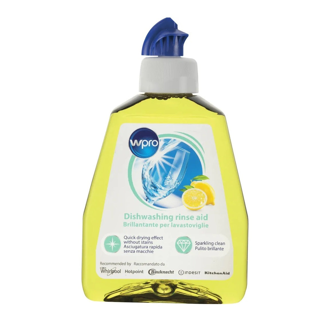 Il brillantante professionale per lavastoviglie Wpro aiuta a rimuovere aloni, macchie e depositi di calcare da stoviglie e bicchieri. Grazie al suo effetto di asciugatura rapida, piatti e bicchieri asciugheranno senza aloni per un pulito brillante. Utilizzabile con tutte le marche di lavastoviglie, lascia una gradevole fragranza di limone.